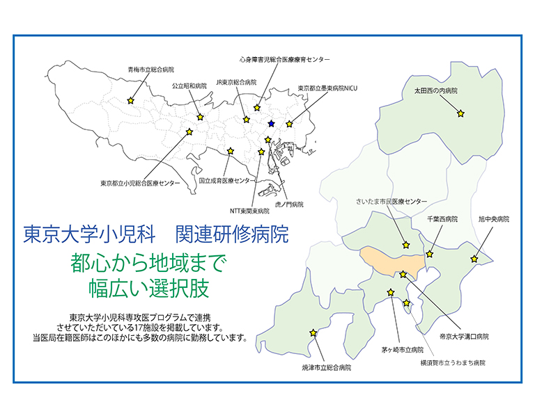 漠然と「小児科」とひとくちにいっても、一般小児診療だけでなく、神経・循環器・血液腫瘍・腎臓・代謝内分泌・アレルギー・NICU・PICU等様々な専門領域があります。東大小児科ならではの多様な関連施設を活用し、一人ひとりの志向に合わせて3年間の専攻研修期間のみならず生涯教育につとめ、あらゆる分野に精通した小児科医の育成を行っています。来たれ、未来の小児科医!東大小児科では多彩な未来が開けます。